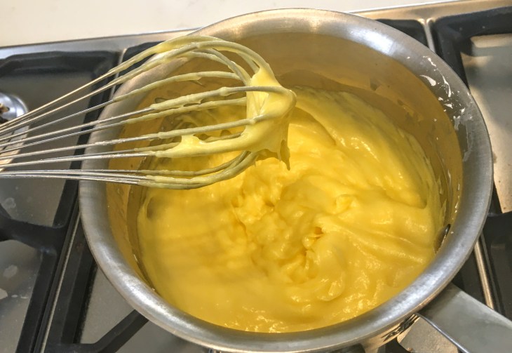 2. Place the pot on the stove top and bring it to low heat. Whisk continuously until the custard mixture thickens (it takes about 10 – 12 minutes). Just when you think it’s never going to thicken, it does. Keep whisking! Continue whisking on the heat until you reach a thick consistency like pudding