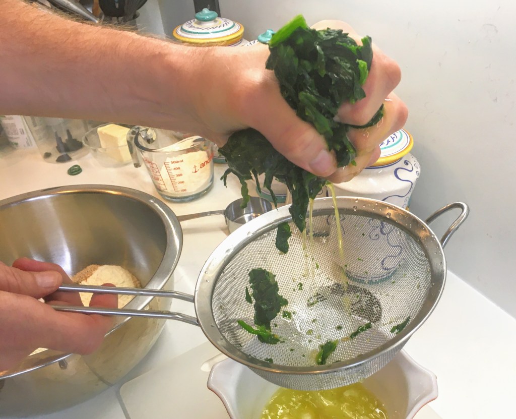 - The next morning, as early as possible… Squeeze out as much liquid from the spinach as possible and then finely mince it