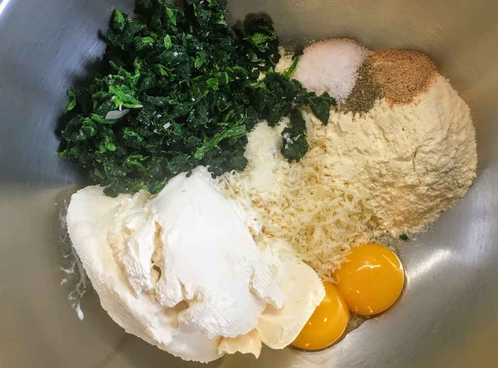 - With a spoon, form approximately 1-inch balls of the ricotta-spinach mixture and gently roll them in the bowl of flour (or semolina), then place each ball on the floured tray. Advice: Don’t make the balls larger than 1-inch or they won’t cook-through properly
