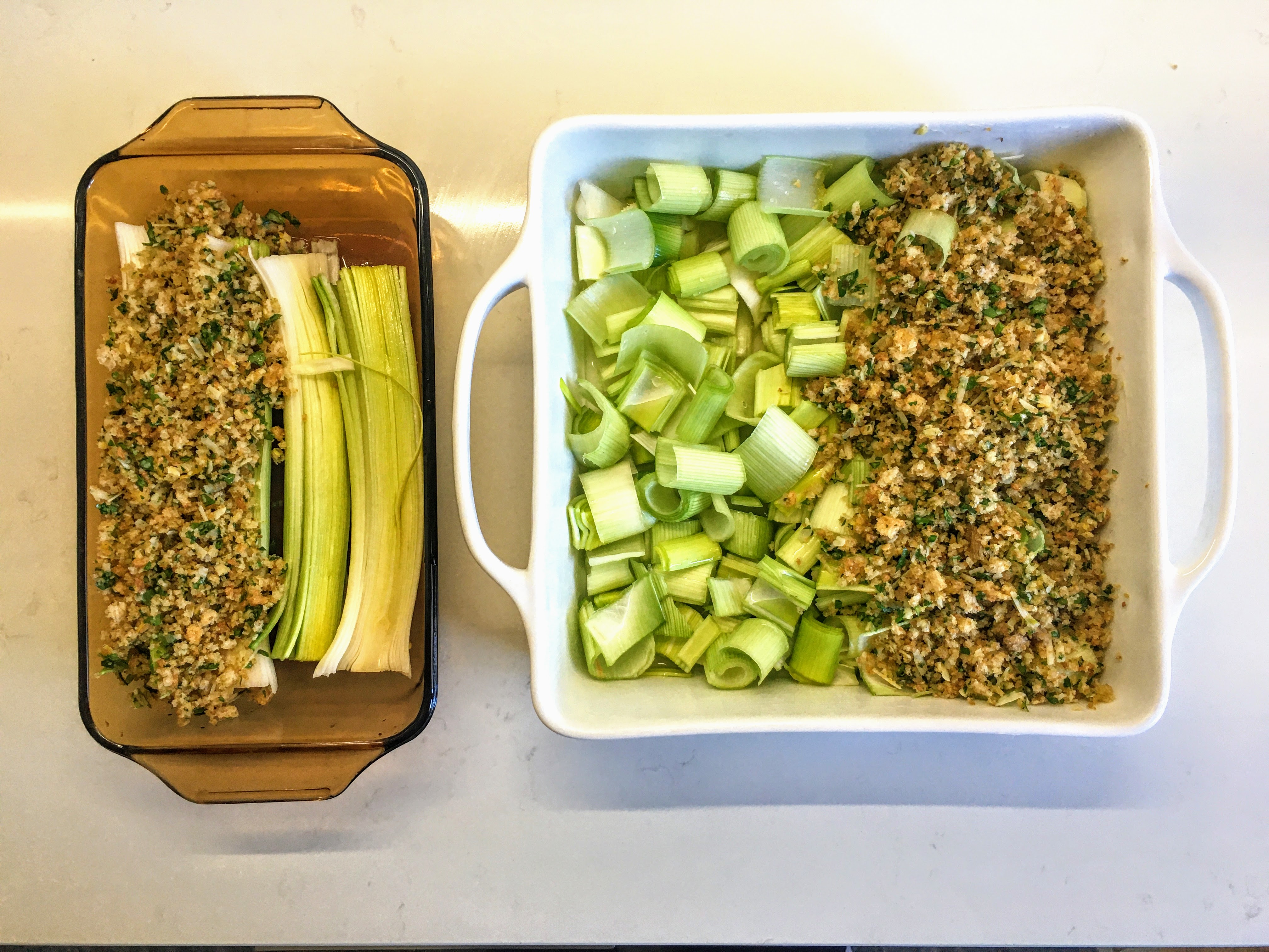 In this recipe you may leave the leeks as long split cut logs ready to be cut on the plate, or you can cut them into little ringlets before baking so they become a spoonable side dish (see photo, below). Either way, once cooked, their deep, sweet flavor with a crunchy, golden, cheesy and herby gratin topping will sure to be a crowd-pleaser.
