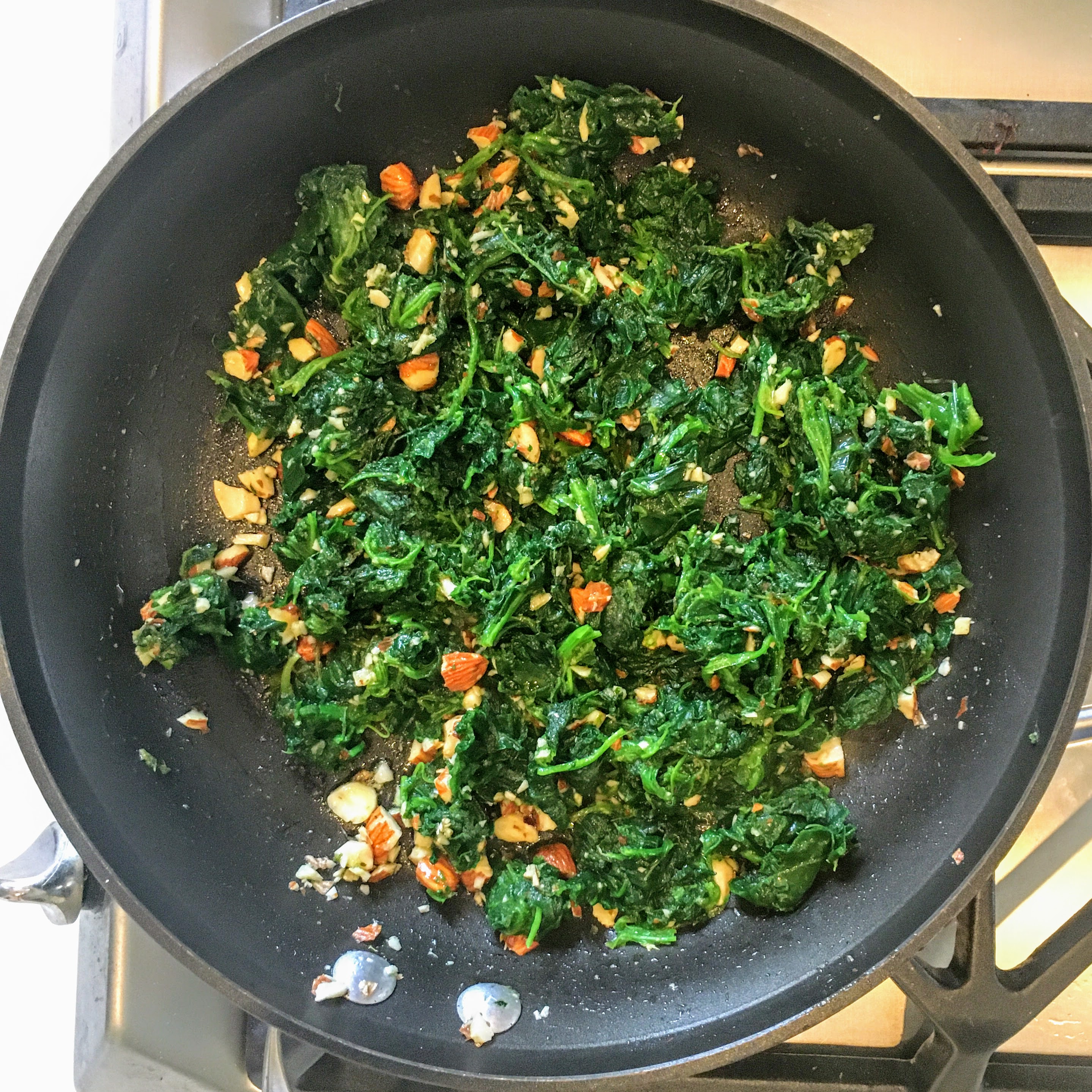 - Bring a sauté pan to medium heat and add the olive oil. Add the garlic and chopped nuts and let them sauté for 1 minute. Reduce heat to low and add the thawed spinach to the pan along with the salt and lemon juice. Cook until the spinach is heated through and most of the liquid has evaporated. Do not cook it so much that it loses its vibrant green color