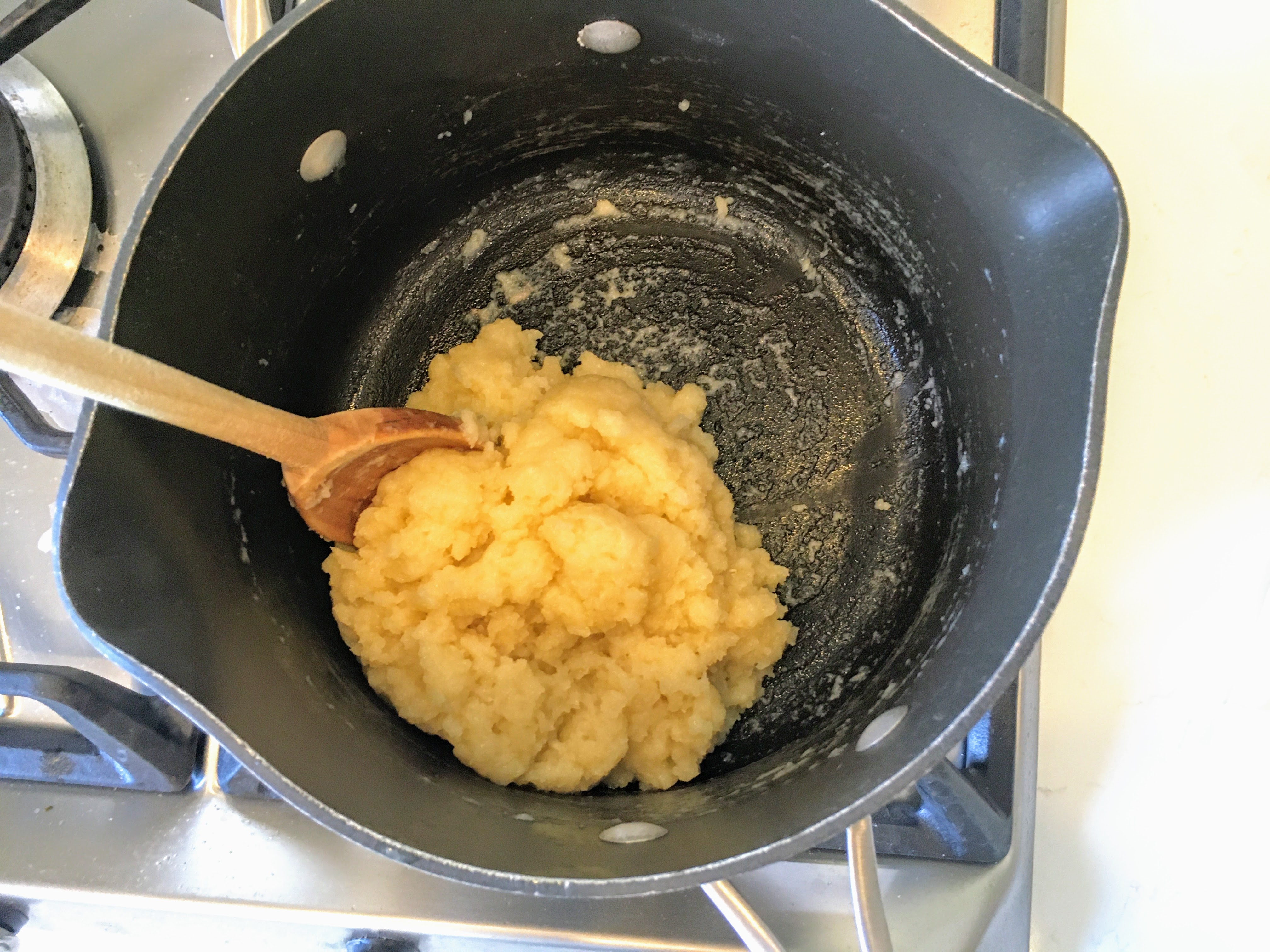 - Once boiling, add the flour to the saucepan all at once. Quickly stir with a wooden spoon until all the flour is incorporated. Keep stirring until the dough forms a rough ball and pulls away from the sides of the pan. This should take about 30 seconds