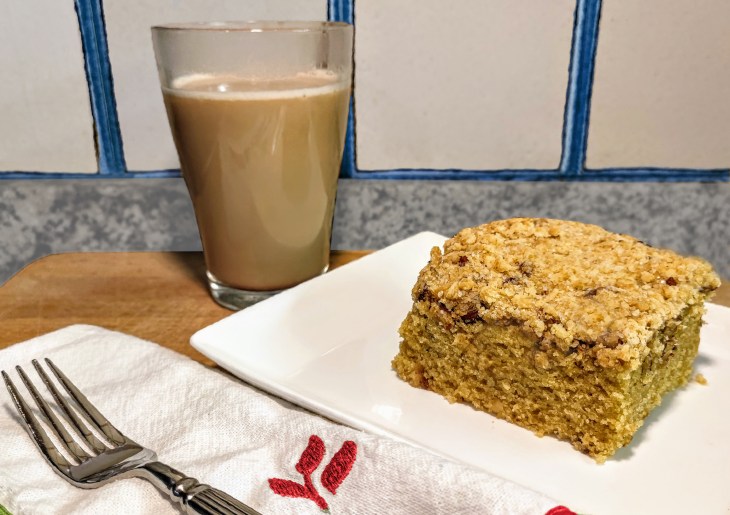 For my daughter’s birthday, we waited until my son was home from his school spring break to celebrate with a cake. He suggested something different such as a coffee cake and she agreed. I made the coffee cake and added 1 teaspoon of cinnamon and 1/4 teaspoon cardamom. Did not add nuts at her request. It was a good, simple, no frills, easy to prepare cake that was nice and moist and not too sweet. It did take longer to bake, around 30 minutes or so.