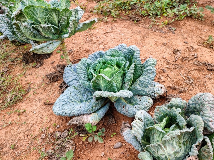 Even after three days of nearly non-stop thunderstorms and pouring rain, we still have four watermelons on the vines. The nights are now cold, but in the day, we’re still getting temperatures in the 70’s(F). The seemingly ever-present butternut squash, and the maturing cabbage, Brussels sprouts, and cauliflower are doing well.