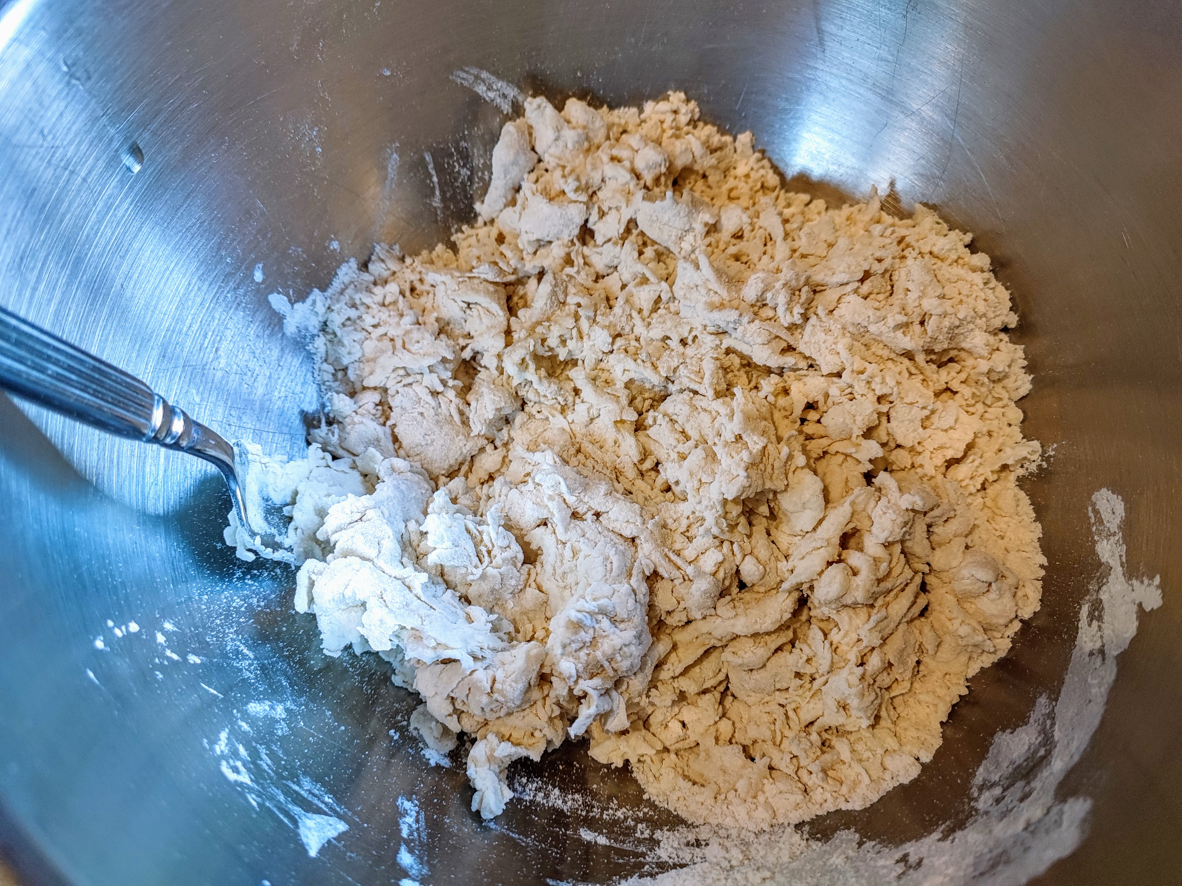 - Add about 80% of the water and mix well with a fork. The dough will look shaggy. Use the remaining water a little at a time if the mixture hasn’t formed a ball after kneading it in the bowl for a minute and if there is still loose flour in the bowl. The amount of water needed will depend on the weather and the type of flour and yogurt you’ve used – they all affect the moisture level of the dough. Wrap the dough ball in plastic wrap and let it rest for 15 minutes