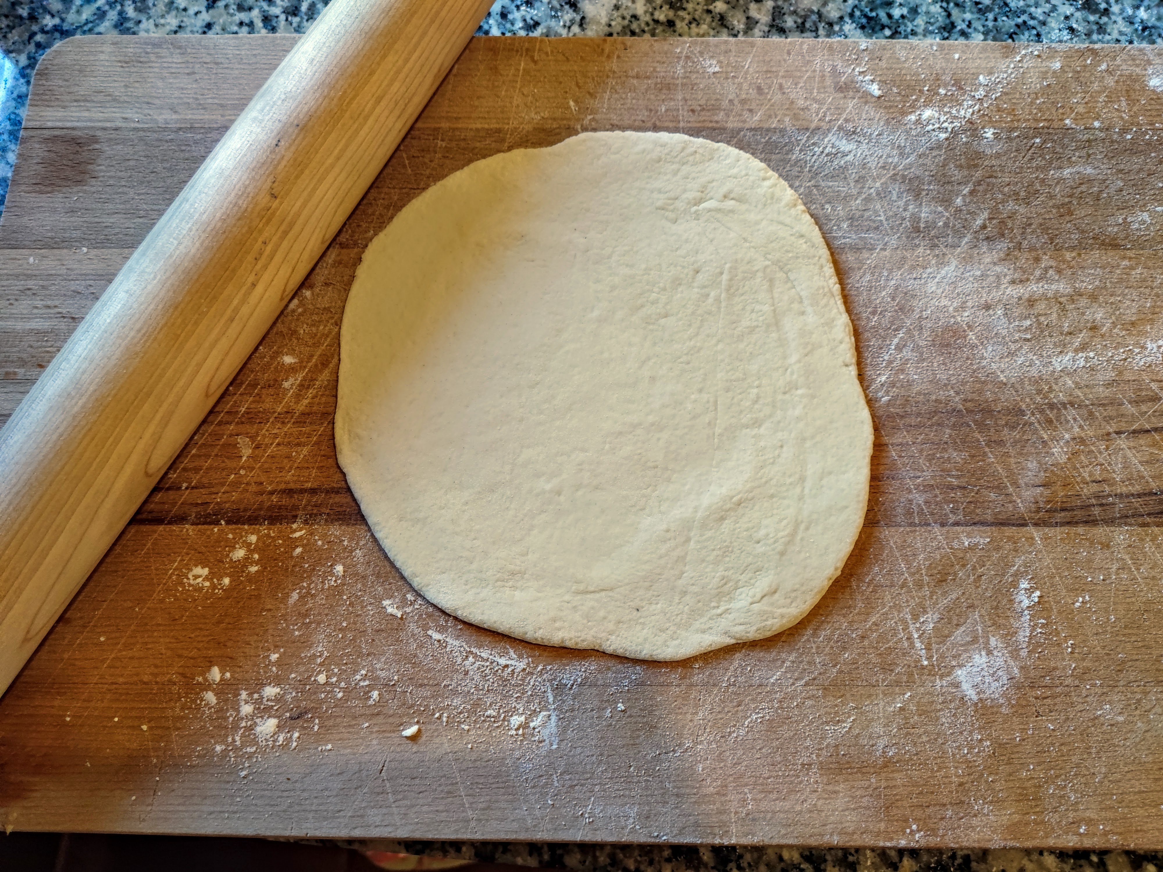 - Divide the dough into four equal parts and roll each part into a ball. With your fingers, press out each ball, one at a time, into a flat circle, then proceed using a rolling pin to roll each disk into 6 – 8-inches (15 – 20 cm) in diameter. Continue with each dough ball and cover them with plastic wrap or a clean dishtowel for 30 minutes