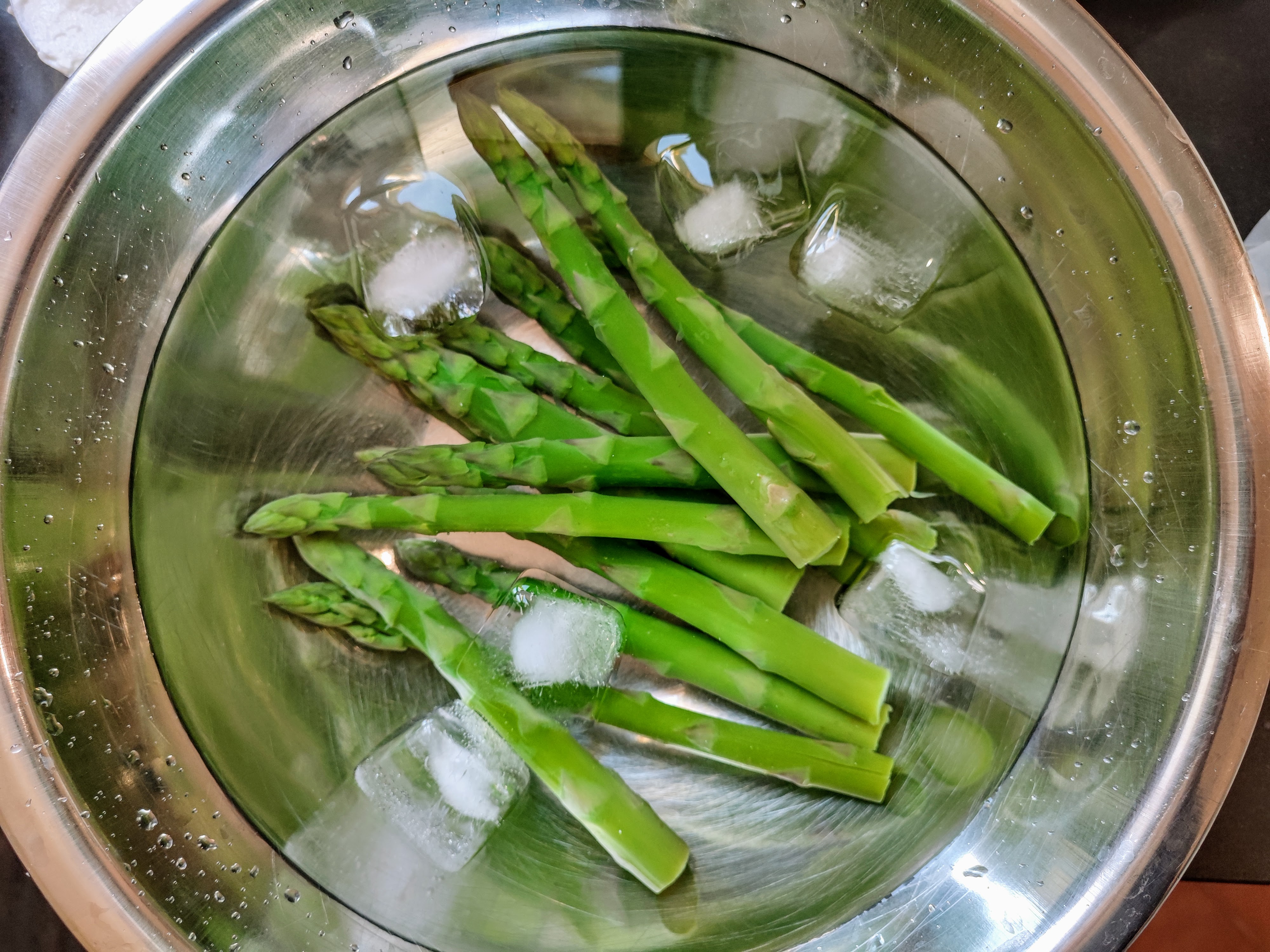 - While the asparagus is boiling, prepare a large bowl with ice water. Place the asparagus into the bowl with ice water and let them rest for several minutes. Remove the asparagus and pat them dry with a clean dish towel