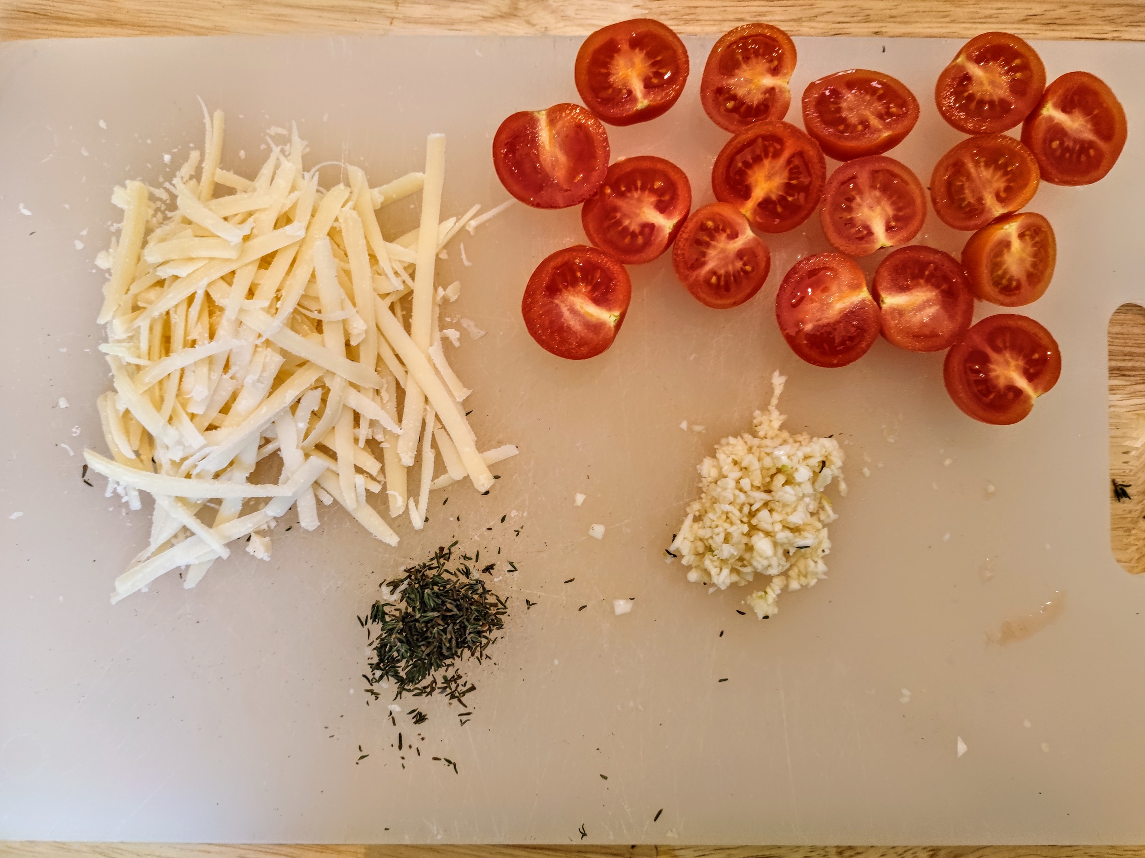 - 1/2 teaspoon dried oregano, or fresh thyme leaves (or, a few torn basil leaves)