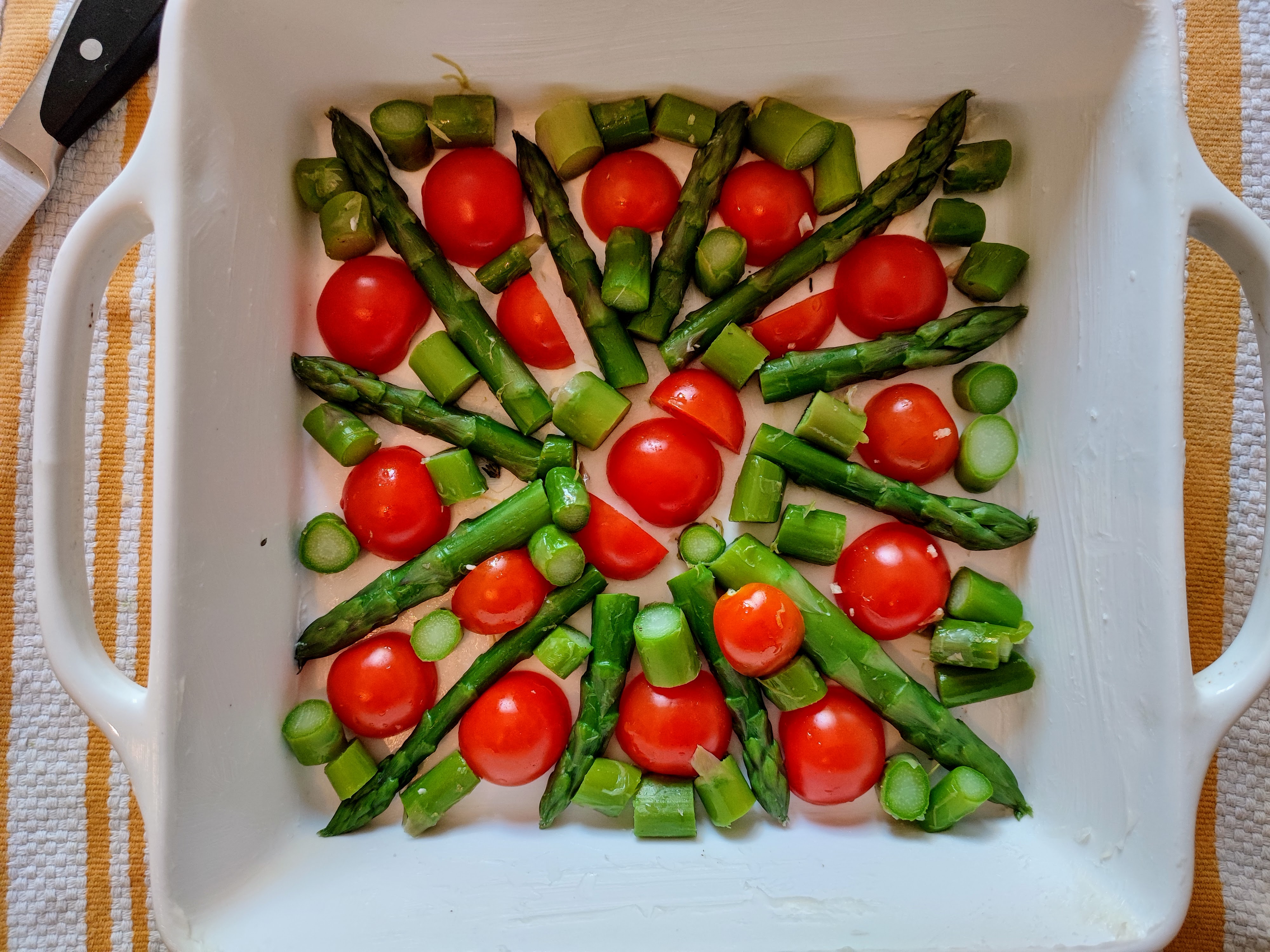 - Cut the cherry tomatoes in half and place them along with the asparagus spears at the bottom of the buttered baking dish. Sprinkle them with the grated cheese