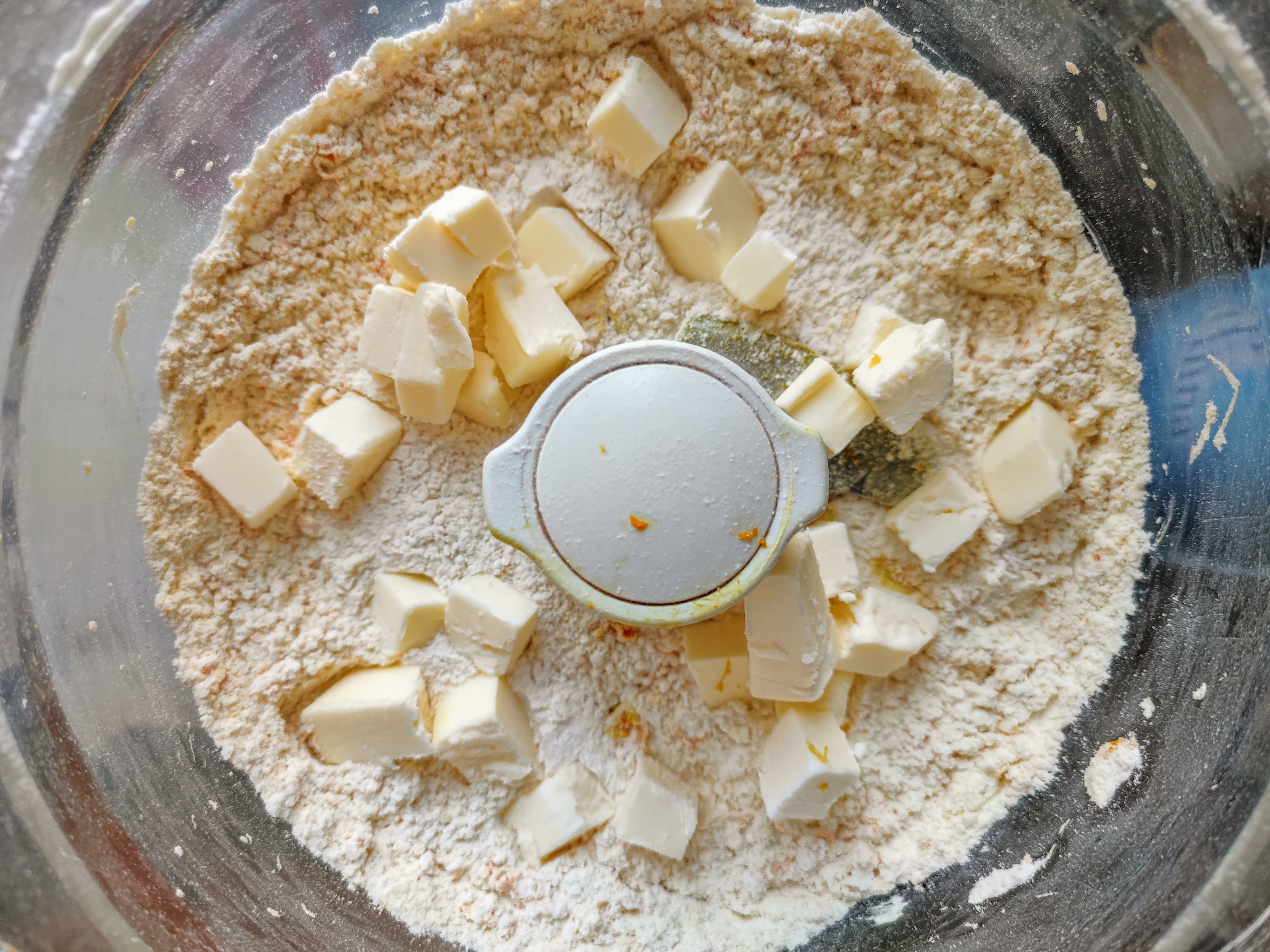 - In either a food processor or a bowl, work in the cold cubed butter until the mixture resembles cornmeal. If you are doing this without a food processor, you can use an old-fashioned pastry blender (the tool shown in the ingredients photo) or by hand, as if you are making pie dough