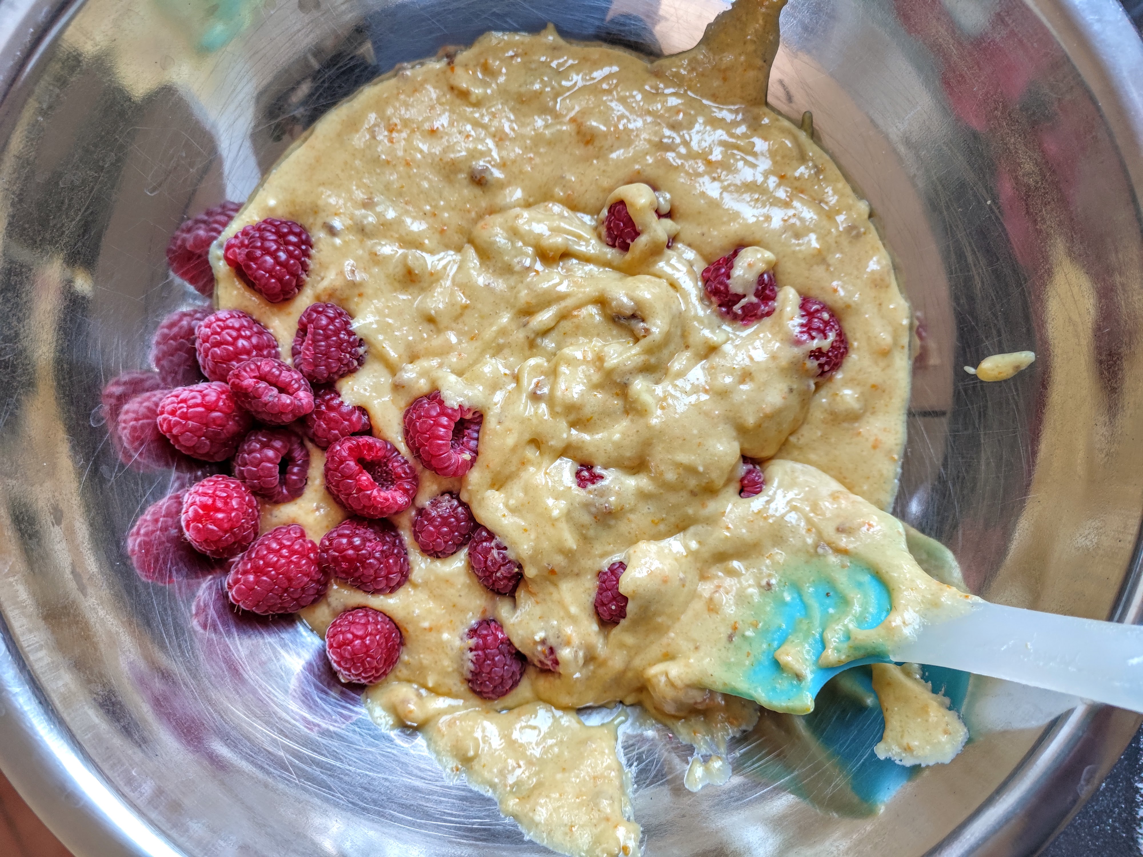 - Fold in the nuts and your mix-ins of choice (I used a pint of raspberries because they are a bit tart like the original cranberry-based recipe, but without the bite.)