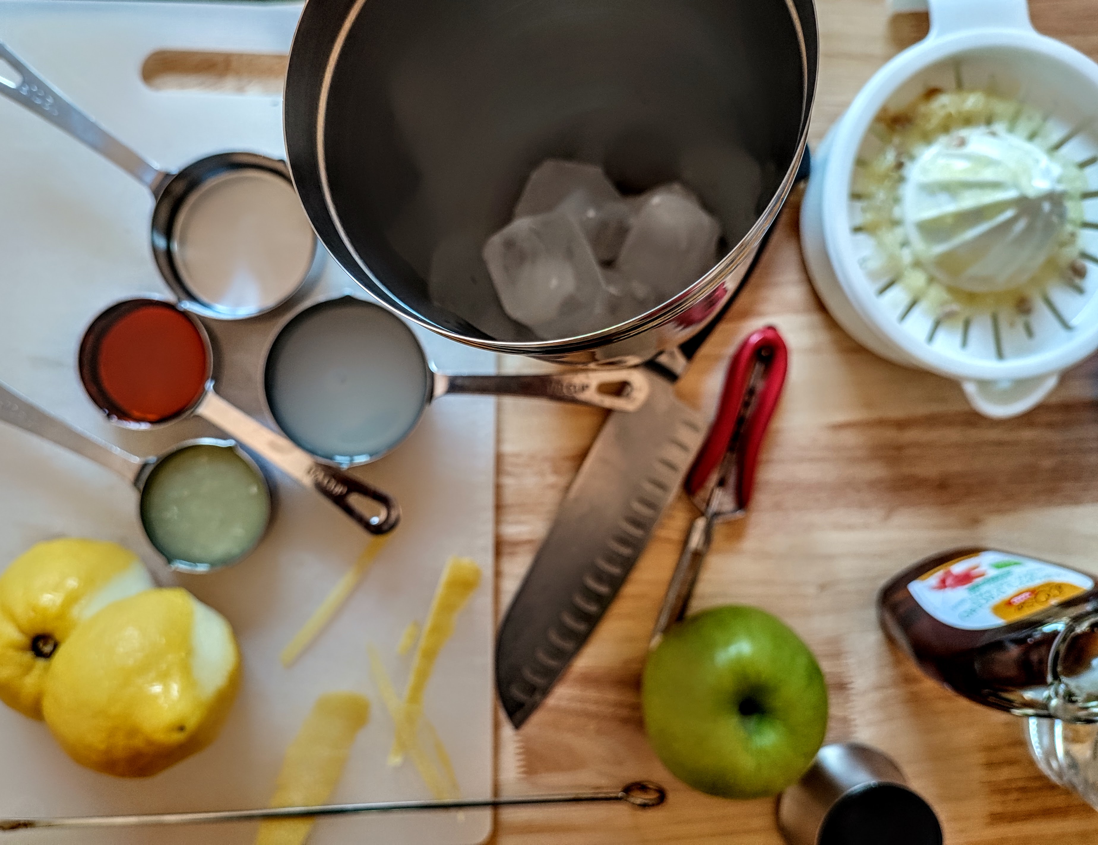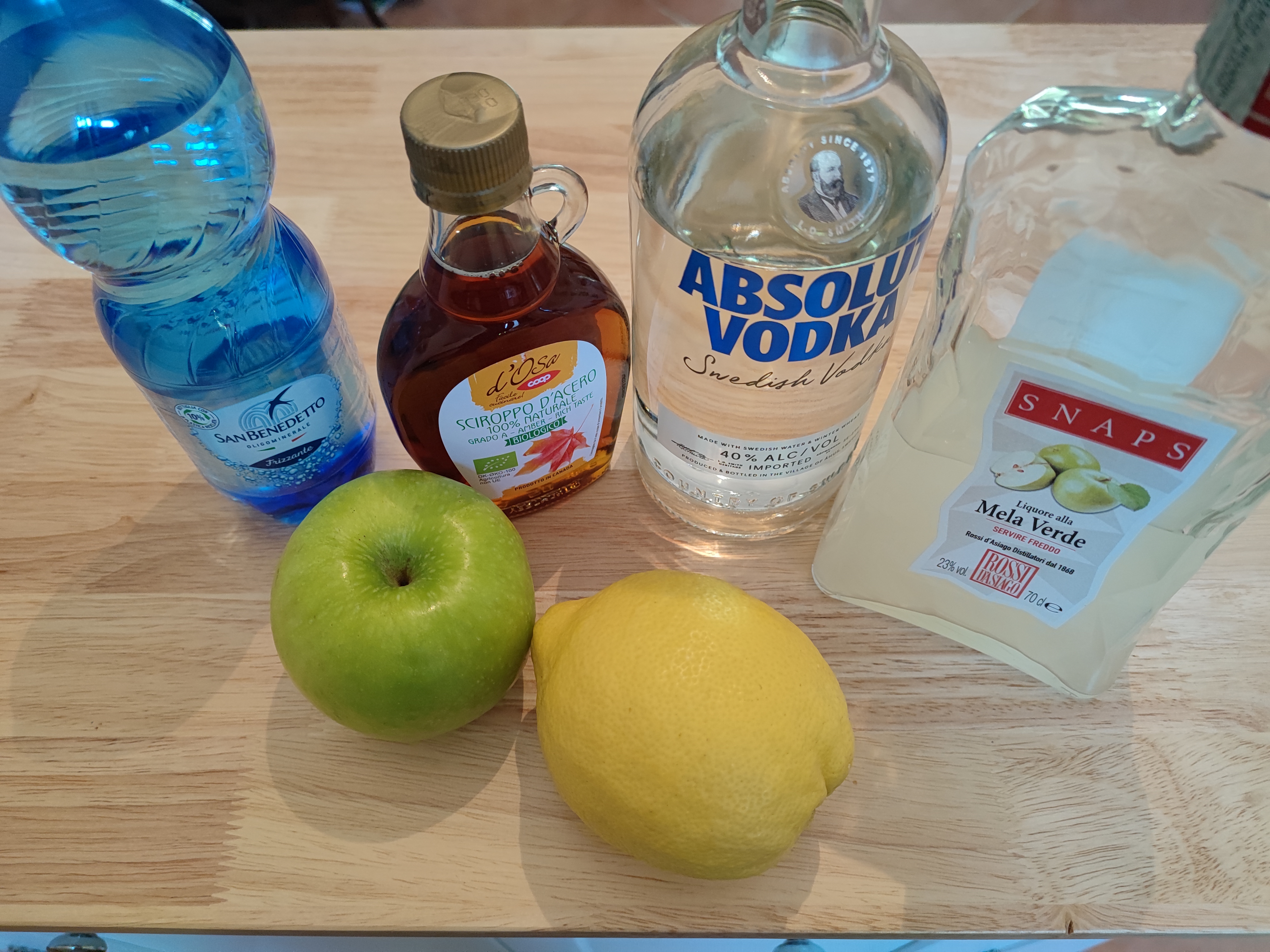 - 1-part apple liquor (not apple brandy) Note: The brand I use is almost clear. Other brands may be brownish or green, so your cocktail may have a different hue than mine