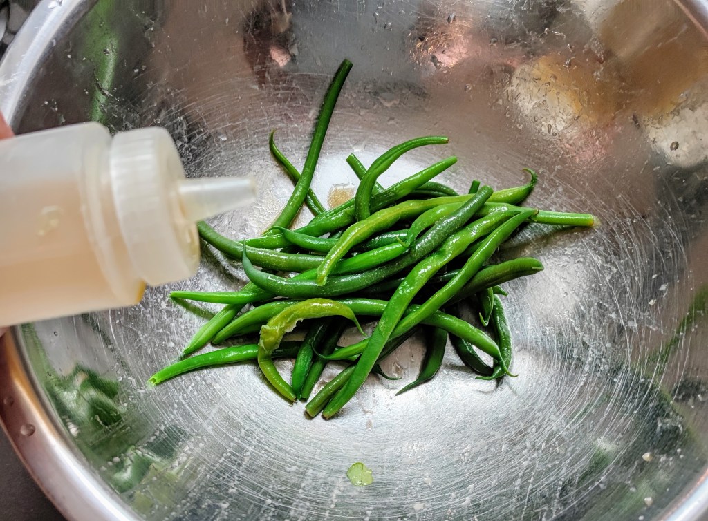 - Wash, de-stem and boil the green beans for 4 – 5 minutes. Once boiled, plunge them into an ice water bath to stop their cooking and preserve their color. Drain and pat them dry with a clean dish towel