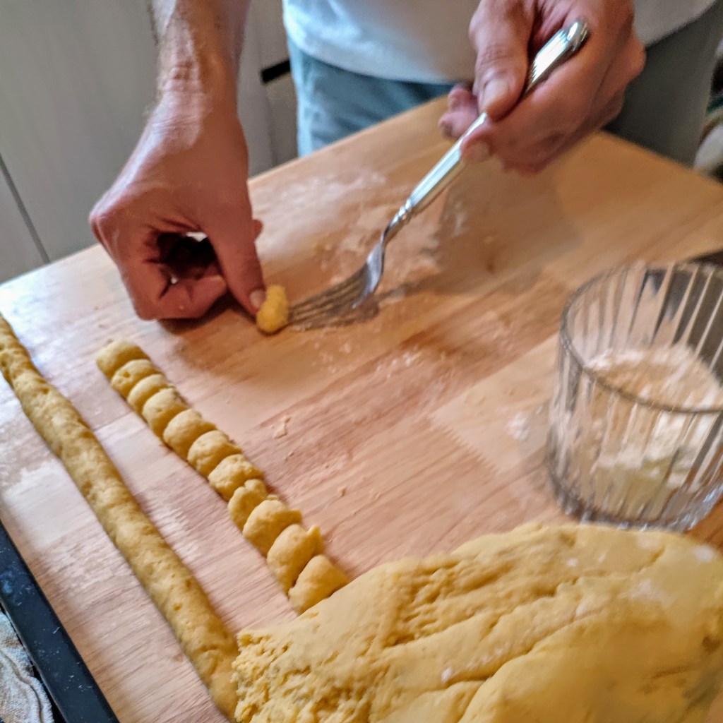 We harvested all our potatoes about a month ago. We really do not have a “cool dry place” to store them, especially with the heat we’ve experienced this summer. So, before they go bad, what better a way to use them than gnocchi – especially since I can freeze raw gnocchi and enjoy them in the fall? This is also a great family and friends activity when it comes time to shape them. If you do it by yourself it is a labor of love, but as a group, shaping them is done before you know it. You’ll be that much closer to eating.
