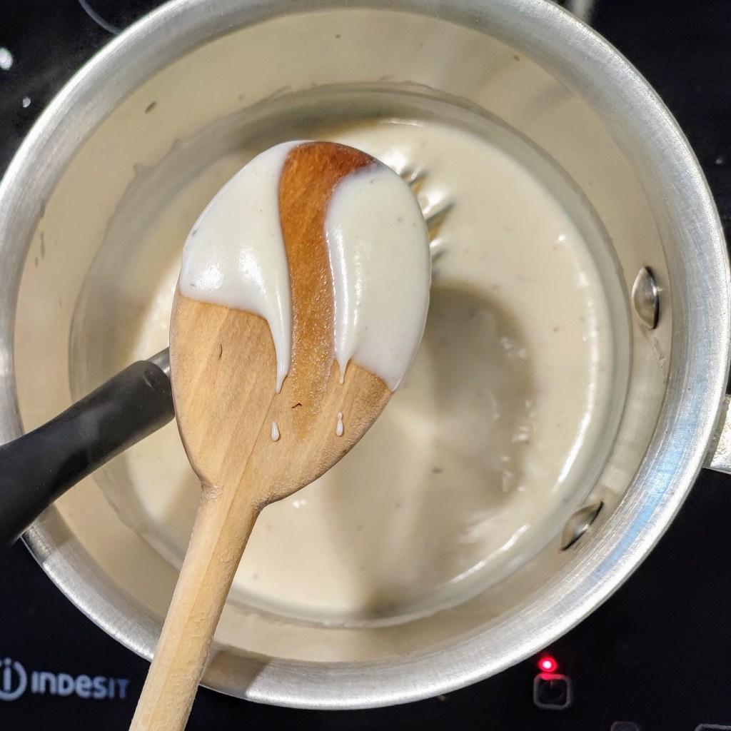- Add the nutmeg, salt, and pepper and stir the béchamel sauce until it thickens, and you can leave a path with your finger on the back of a wooden spoon (see photo)