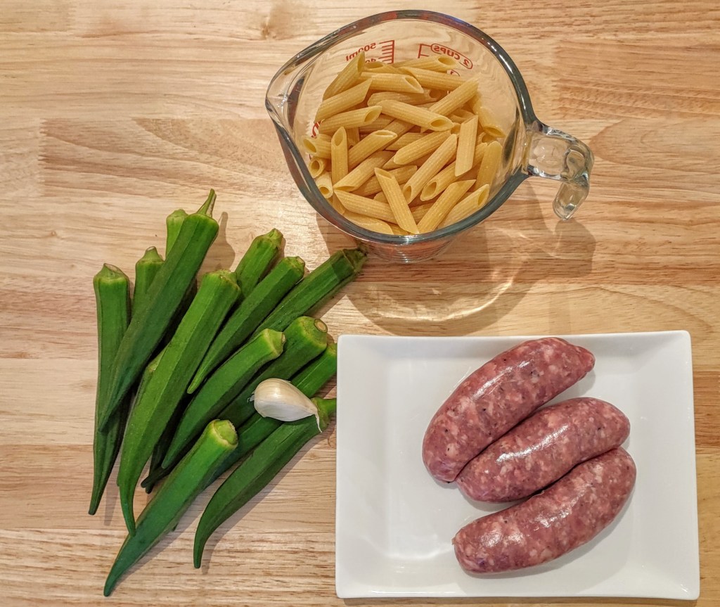 Pasta with sausage and okra, is by no means classical Italian food. However, the combination of sweet Italian sausage simmered with okra largely creates its own magical sauce with very few, common ingredients — and you can be eating in 25 minutes. It is definitely more delicious than the sum of its ingredients.