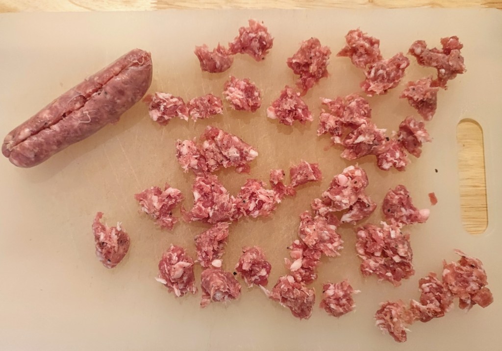 - Remove the casings from the sausage and break the sausage into little pieces, discarding the casings. I find the easiest way to do this is to make a gentle vertical slice along the long side of the sausage and then peel the casing back. See photo