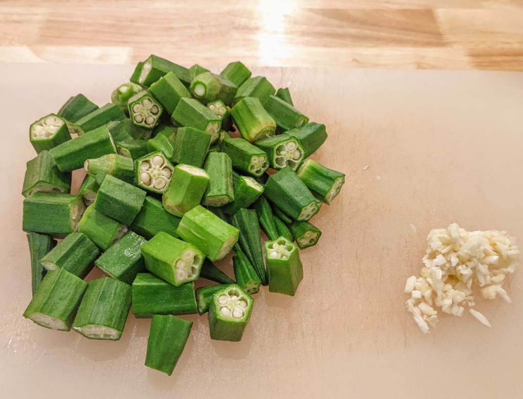 - Trim ends from okra, then cut them into roughly 1-inch (2 cm) pieces. Set aside