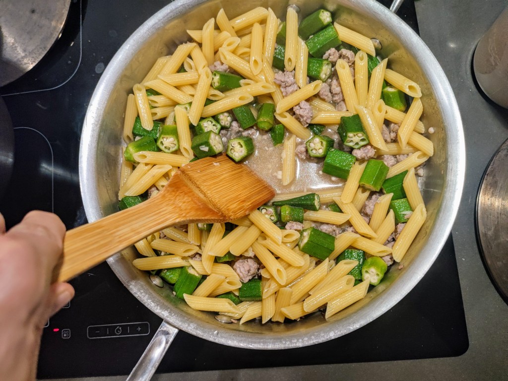 - As soon as the penne is mostly cooked (again, two minutes shy of the package directions), transfer it to the pan with the sausage and okra using a slotted spoon or a “kitchen spider.” Add 1 cup of the pasta water to the pan and raise the heat to medium high. Continuously stir the pasta, sausage and okra until the pasta water is mostly gone. See the photos for an example