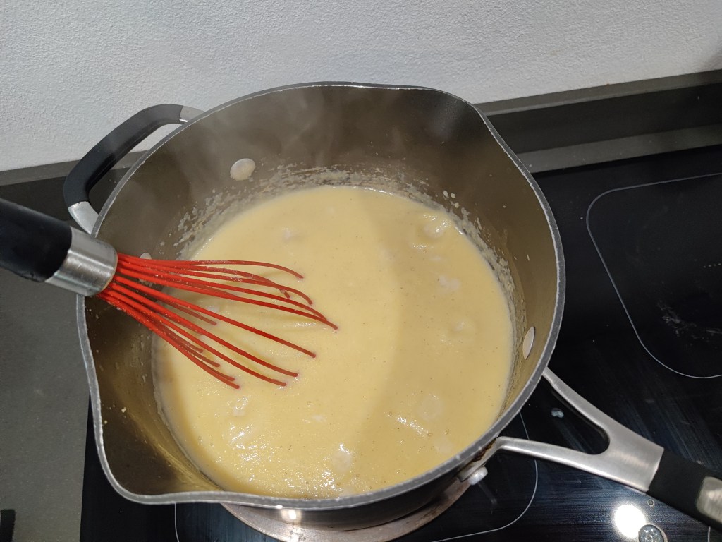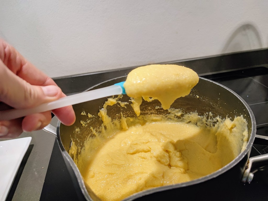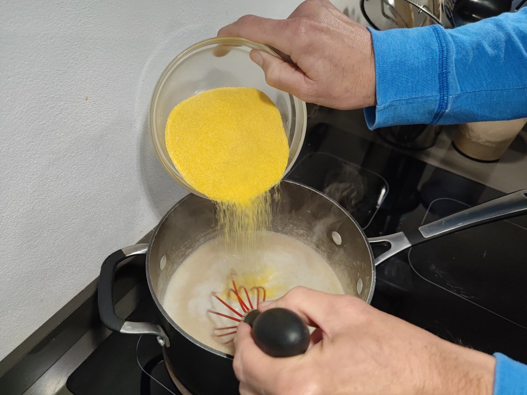 4. In a slow and steady stream, add the polenta while whisking the hot liquid and continue to whisk until all the polenta is incorporated and there are no lumps