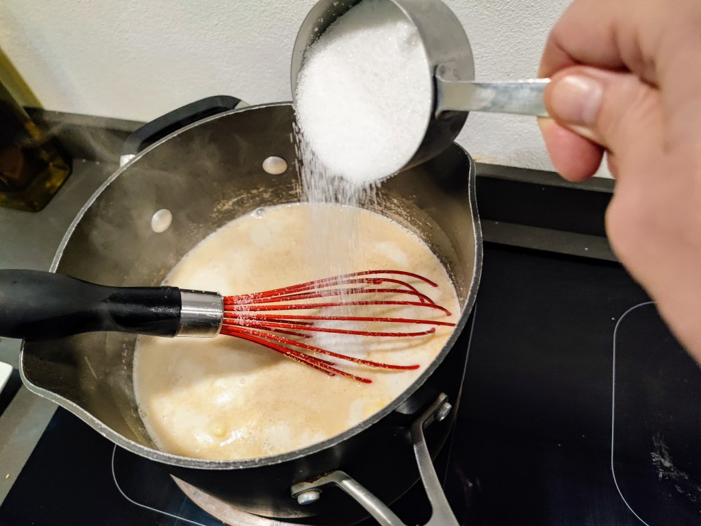 5. Add 3/4 cup of the sugar and continue to whisk until the polenta has thickened and can sit up and hold its shape on a spoon. If you want to add the optional diced apples or raisins or other mix-ins, add them at the same time as the sugar. My polenta usually takes about 10 minutes to thicken, but yours may vary depending on the brand and how fine or coarse is the grain