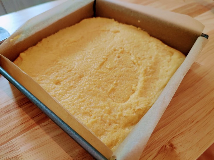1. Line an 8-inch X 8-inch (20 cm X 20 cm) pan with parchment paper or aluminum foil with enough overhang to lift out the polenta once it has cooled
