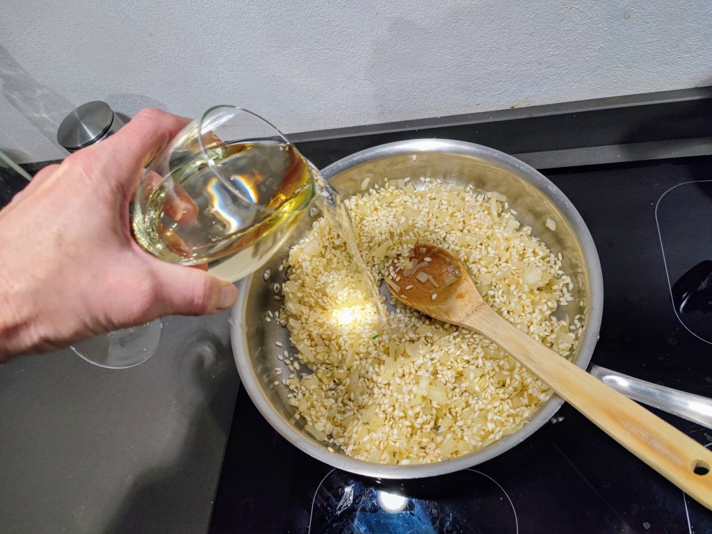 - Add the white wine to the rice and simmer and stir until the wine is nearly evaporated