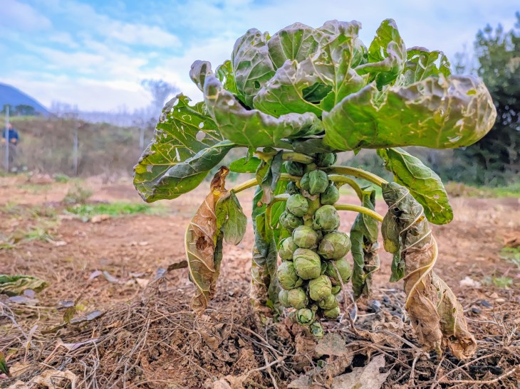 Another argument for not plowing the field right away is that we still have about a dozen cabbages and some herbs left. And – what’s this?! One random Brussel sprout that looked like a cabbage until just a couple of weeks ago. I didn’t think any of them had made it past sprouting, but lo and behold, let there be Brussels!