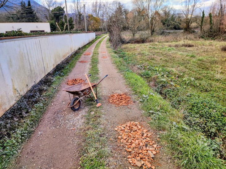 Home renovations continue and I’m afraid we are not any closer to moving in than we were two weeks ago. Sigh… Speaking of renovations, the annual filling of dirt road potholes has begun. Thanks to all the worker’s trucks and our daily trash service truck, who all drive like banshees, the potholes form when there is a lot of rain. We had leftover terracotta roof tiles, so I used a sledgehammer and broke them up into little piece to fill the potholes. I had seen this “technique” while taking my daily passeggiata (a stroll). Country living at its finest!