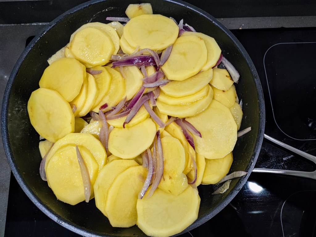 - While the onions are cooking, peel the potatoes and then thinly slice them (between an 1/8 inch and 1/4 inch, or approximately .5 cm). A mandolin is a useful tool for this if you have one. Add the potatoes to the pan with the onions and very gently stir to combine, trying not to break apart the potatoes. About every five (5) minutes, stir the potatoes until they are full cooked and there are some golden edges (this may take between 30 – 35 minutes)
