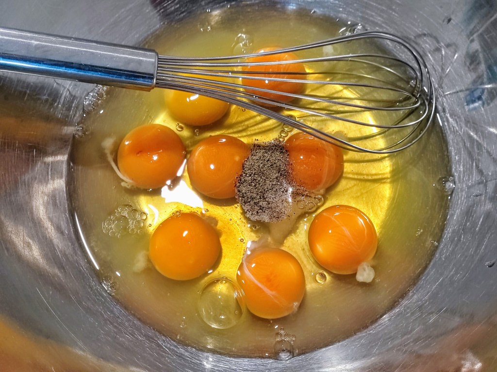 - While the potatoes are cooking, whisk the eggs, salt, and pepper into an extra-large bowl until they are lightly frothy