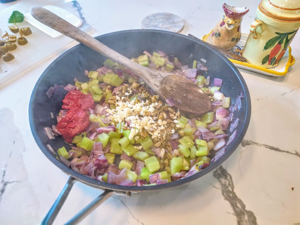 - Add the tomato paste, olives, capers, and garlic, then sauté for 1 minute. Add the crushed canned tomatoes, and simmer for 10 minutes. Note: add a splash of water (but no more than 1/4 cup) to the emptied can of tomatoes to get all the flavorful tomato juices out of the can. Pour the water into the sauté pan
