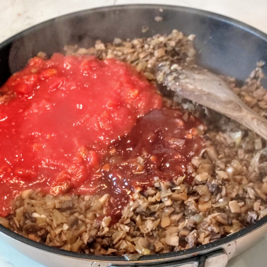 - For the Mushroom Sloppy Joe’s, prepare the mushrooms by removing and discarding the stems, clean and finely chop the mushroom caps. Place the oil in a medium sauté pan and bring to medium heat. Add the mushrooms, onions, salt and pepper and stir to coat with the oil. Simmer until the mushrooms release their liquid and the liquid evaporates from the pan, about 15 – 20 minutes. Add the minced garlic in the last minute