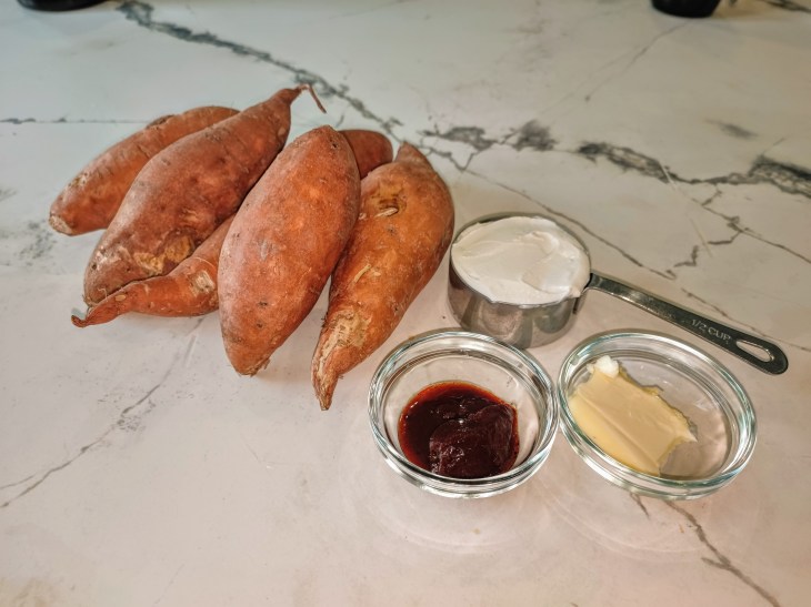 - 2 pounds (about 1 kg) sweet potatoes, washed, peeled, and 1-inch diced