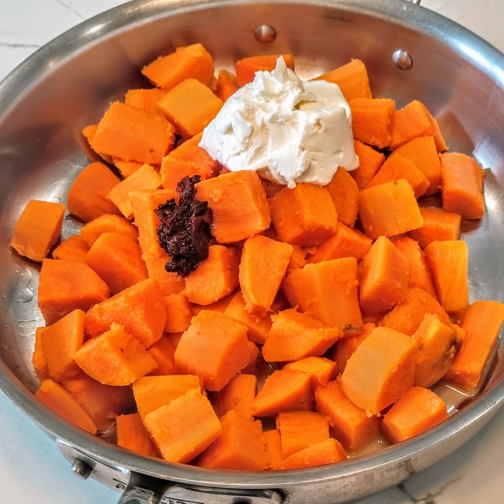 - Add the cream cheese, chipotle in adobe sauce (just a little to start with!), and butter to the pan and mash with a potato masher until you reach the consistency that you like. If you don’t have a potato masher, you can use an electric beater or large wood spoon