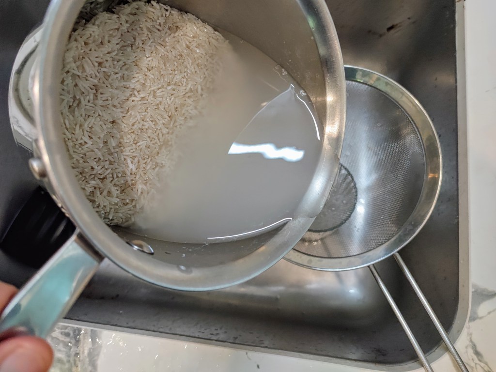 - 1 1/2 cups uncooked basmati rice. IMPORTANT: Soak and rinse this rice at least three times over a period of a couple of hours to ensure fluffy, not sticky, rice