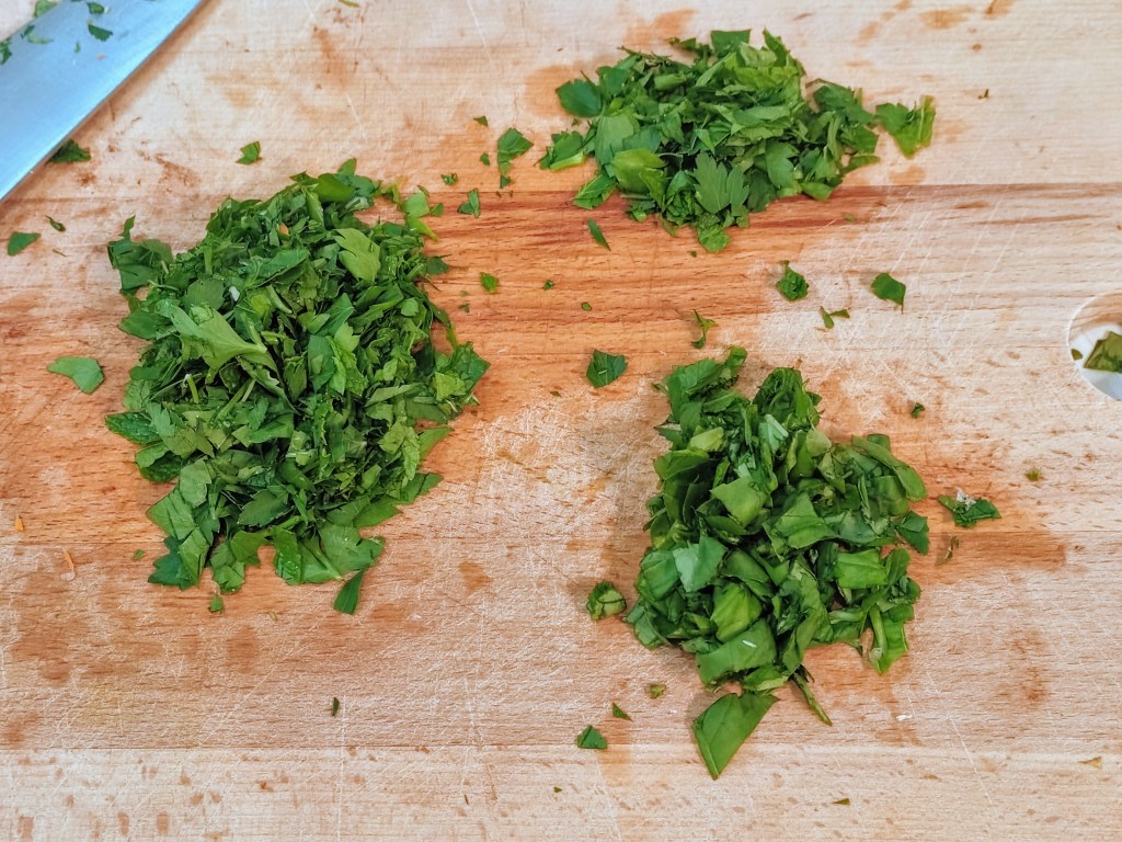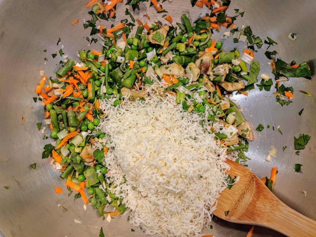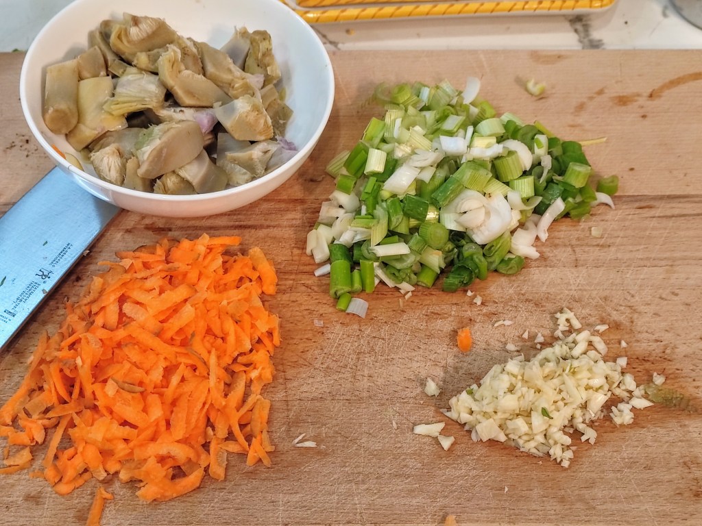 - Chop the artichoke hearts into bite sized pieces, then finely chop the scallions or spring onions including the light green parts and place them in bowl with asparagus and beans. Do the same with any herbs you are using along with the minced garlic and finely grated cheese and carrot. Mix all these ingredients well, but gently