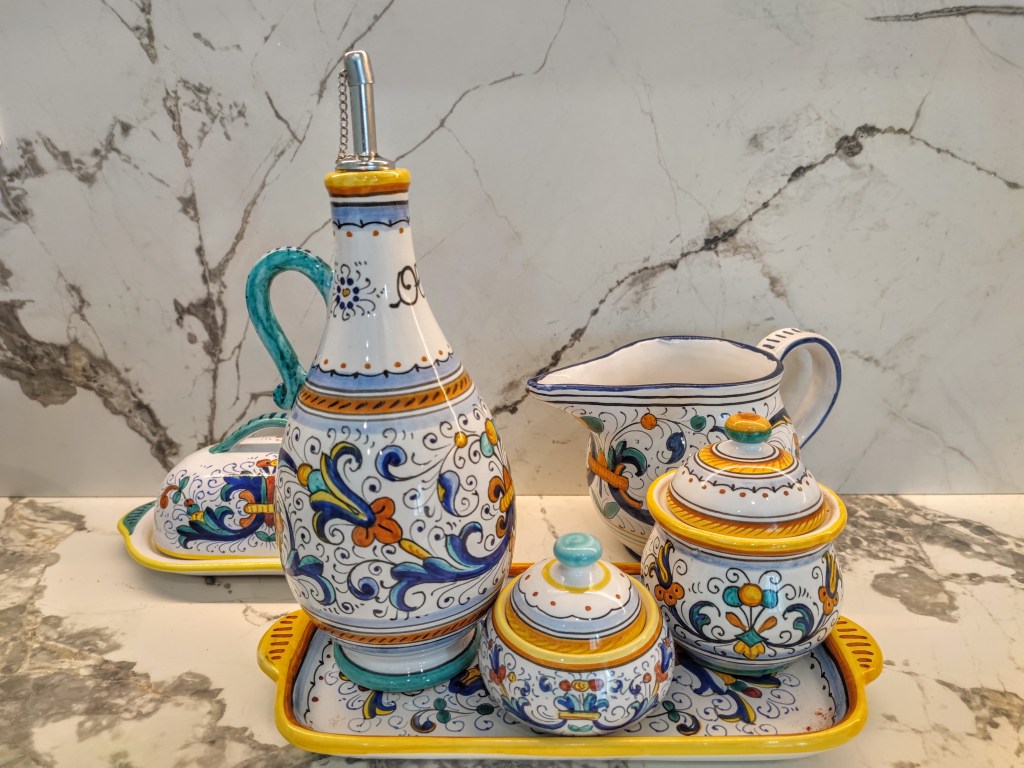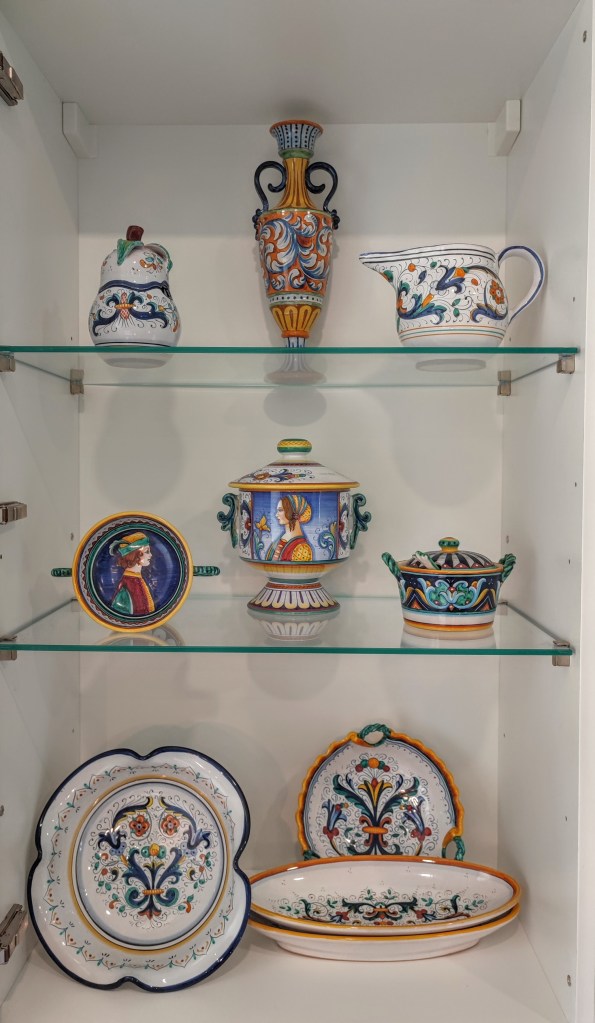 Another reason we chose to go to Perugia and the surrounding area was to visit Deruta, a little town about 20 minutes from the capital. Since earlier than the Renaissance, Deruta has been, and still is, famous for their pottery known as majolica. Many of their ceremonial plates and vases may be found in museums throughout the world. I have been collecting pieces for decades including plates, cups, saucers, vases, serving platters, wall art, a soup tureen, and even a clock.