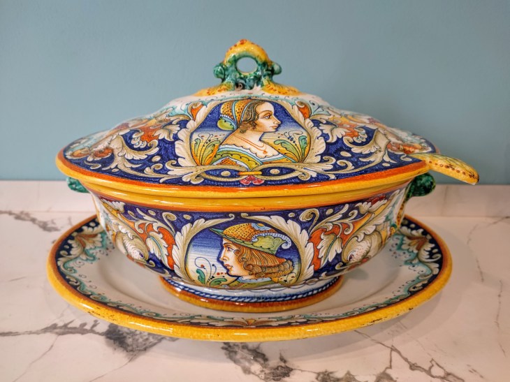 My first attempt to go to Deruta was in the late 1990s. I traveled from Florence to Perugia via train and a woman sitting next to me asked, “Why do you want to go to Deruta?!” which later became a joke. Although she was from the region, and Italian, she did not know about the pottery. That trip was a failure because at that time there were no available taxis from the Perugia train station to Deruta so there was no way for me to get there. Other than enjoying some Baci chocolates, I went back to Florence frustrated and empty handed. During the next trip, I rented a car and was successful. The irony is that I had several fragile pieces (including a large soup terrine) shipped to me in Washington, D.C., where I lived at the time, which were then packed and moved to San Francisco where I lived for 16 years. They have come full circle and are back in Italy where I now reside. Their value has gone up, if only for the shipping cost!