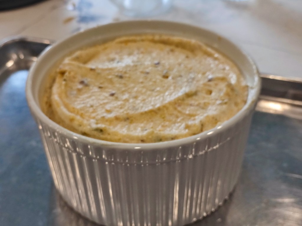 - Place the dish on a baking sheet and bake for 25 to 30 minutes. The soufflé should be well set in the center and nicely browned. Note: Browned is the key word here. It might look like it’s over baking, but it needs the time in the oven to firm up in the center.