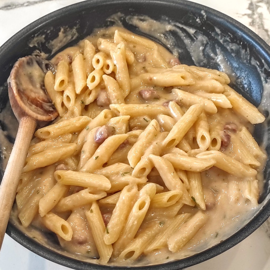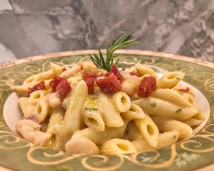 Pasta with beans (and even pasta with potatoes, a different recipe) is a staple throughout Italy with many regional variations throughout the country. Cannellini beans with a form of pork (pancetta, guanciale, or even thick cut bacon) is a classic. This pasta is perfect for colder weather given its rich, hardy nature.