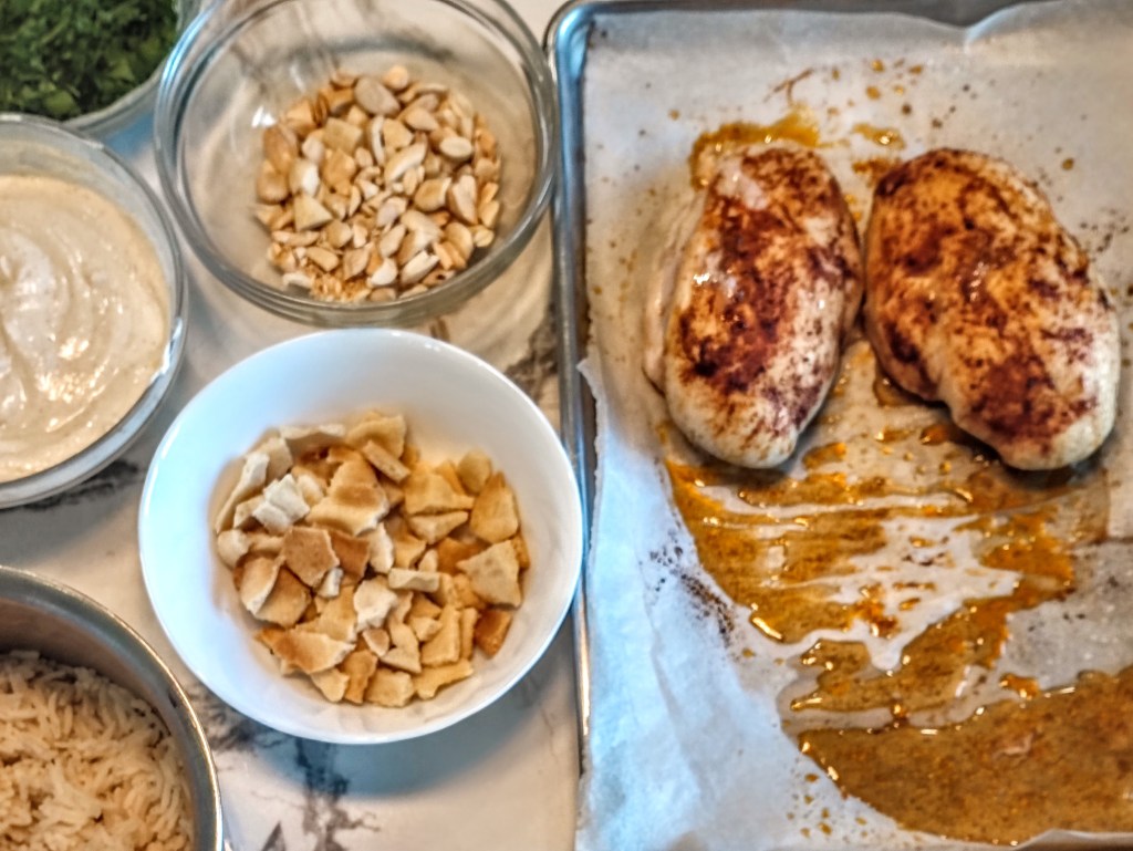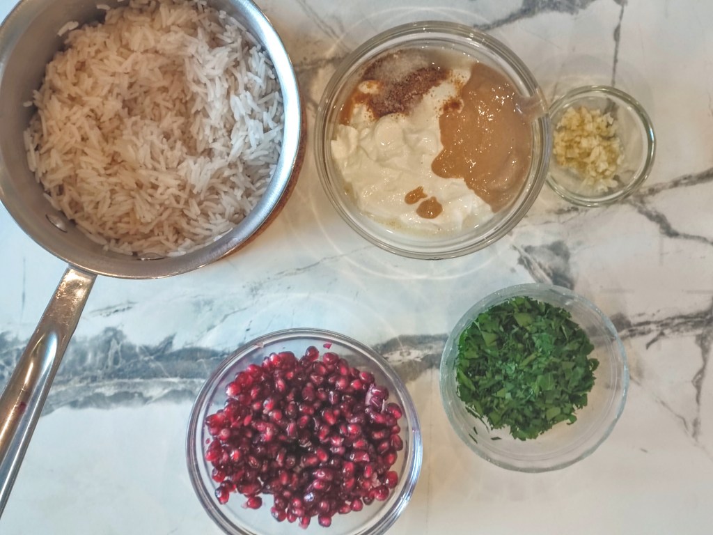 This recipe has a number of parts, but don’t be intimidated. It’s largely a “cook rice and chicken separately, make a yogurt sauce, and then assemble” recipe. But altogether it’s magic.