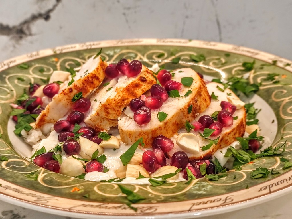 - Begin assembling the Fatet Djaj in four shallow bowls by first placing in the rice at the bottom of each bowl. Spoon the yogurt sauce over the rice. Then evenly divide the chicken breast slices over the rice. Top with the minced parsley, pomegranate arils and toasted almonds.