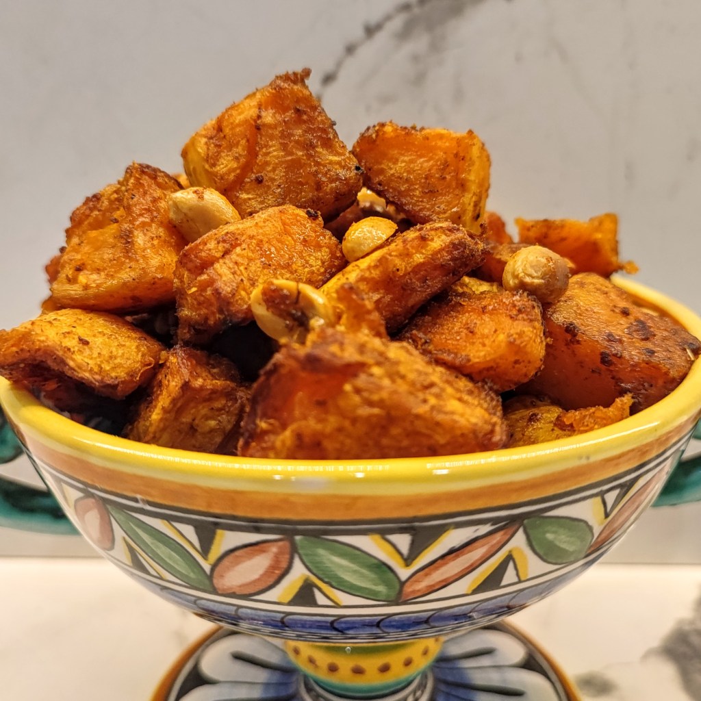 - In the last 5 minutes of roasting, add the peanuts, if using, and toss well. Transfer the squash to a serving bowl and serve