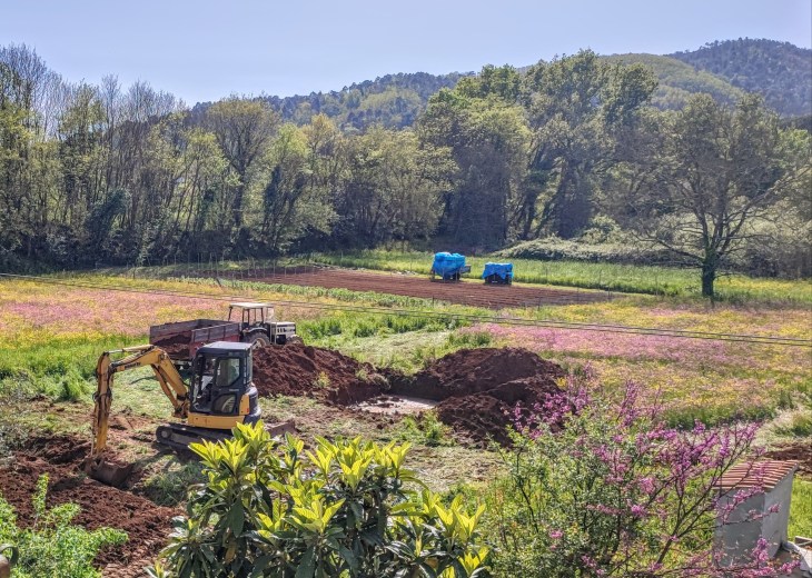We finally had the remaining awful and ever-spreading bamboo dug up and deeply buried. What a relief — we’re glad to have that behind us! Old, giant piles of bamboo roots were sitting there so long they started regrowing themselves and were covered with weeds. The most surprising thing about the job was that the backhoe operator hit water at only 1.5 meters deep. We’ve had a lot of rain over the winter and into early spring, but we didn’t expect the water table to be so high. I wonder what a geologist and engineer will have to say about the ground water level if we ever decide to put in a pool someday.