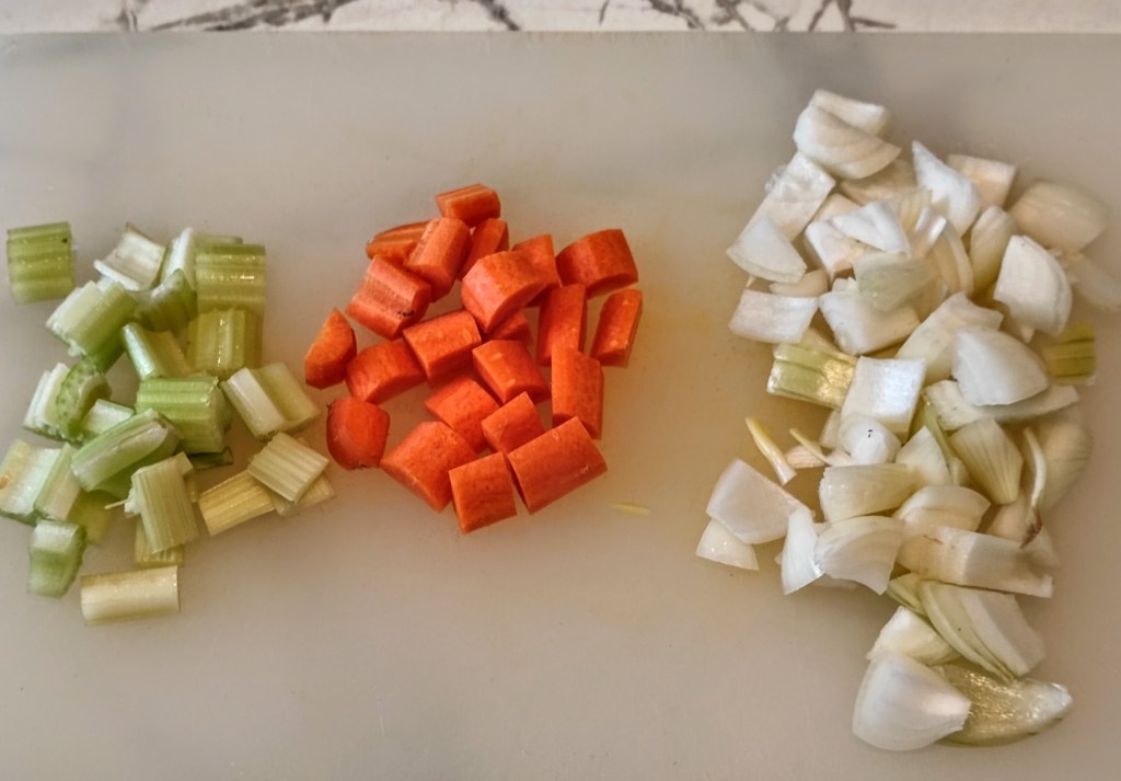 Mirepoix is the French word for an aromatic blend of two-parts onion, and one part each of celery and carrots (a 2:1:1 ratio). This is used to build a base of flavors in soups, stews, meatloaves, ragus, and sauces. The vegetables may be cut chunky for soups and stews, or very finely for sauces. The Italian word for this vegetable blend is soffritto, which translates as, “sauteed.” In fact, when an Italian dish calls for soffritto, it is usually sauteed first before using. Another difference is that the Italian version is often finely minced to add flavor and more-or-less disappears and melts into whatever you’re making. Using a food processor, if you have one, you can do this in no time, lickety split!