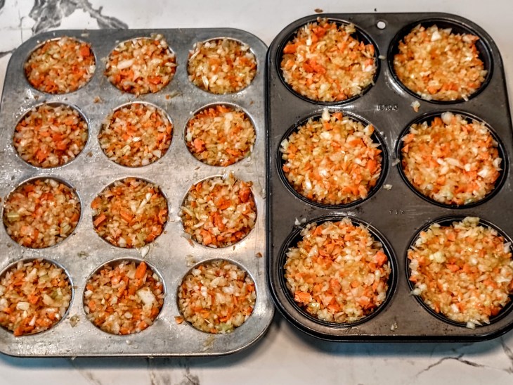 Here’s how: Chopping, dicing, and mincing are easy, but can be time-consuming. Instead of starting from scratch each time you cook, you could dedicate a small block of time and create a large batch of mirepoix or soffritto, with just a little olive oil drizzled in and mixed well. Next, freeze this mixture in muffin tins packed down with a spoon. Once frozen solid (overnight is great), set them out at room temperature for 10 minutes for easy removal with a butter knife or an off-set spatula. Finally, transfer the mirepoix pucks or soffritto frisbees into a freezer bags. Then, whatever your cooking needs, you’ll have this aromatic base at the ready.