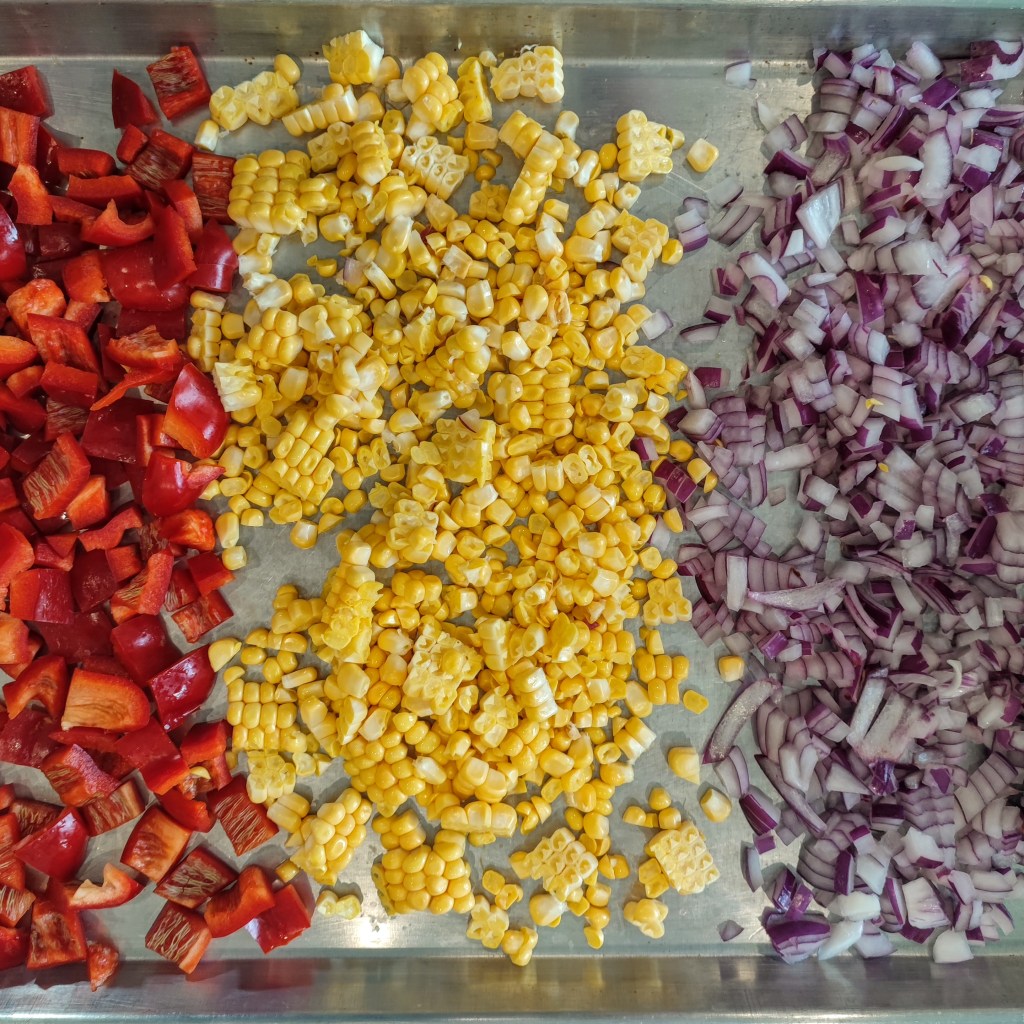 - Dice the vegetables. Decide if you want to keep them raw or give them a quick broil. If broiling to achieve a slight char and smoky taste, arrange them on a cooking sheet and broil for 6 – 8 minutes, with the oven rack placed slightly above the upper third of the oven (not too close to the broiler). Keep an eye on the vegetables so that they don’t burn, although a little char is desirable