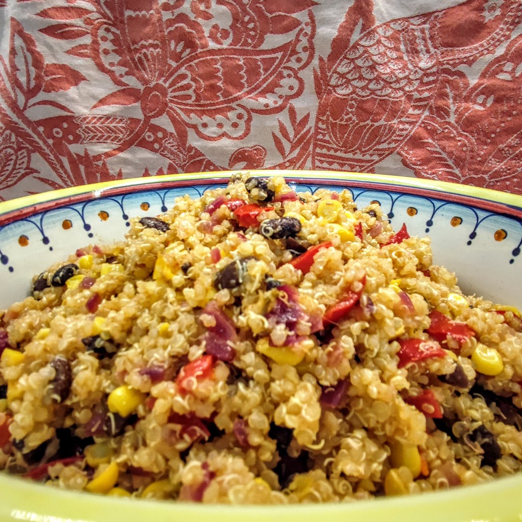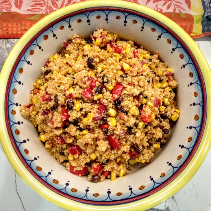 - Whisk together all the vinaigrette ingredients, add it to the quinoa and vegetables, and mix thoroughly. You may eat this immediately, but it’s better if you let it sit for an hour so the vinaigrette can get absorbed into the quinoa and vegetables and the spices may further “bloom”