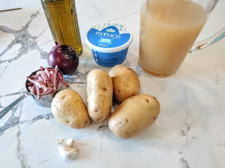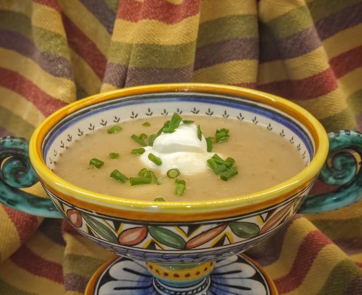 In its essence, this soup is broth or stock of your choice, potatoes, an onion and rendered pork (again, your choice of which type) all gently cooked, then finely blended until creamy. To offset the sumptuousness of the soup you can add a nice tangy dollop of sour cream, yogurt, or creme fraiche along with a sprinkling of herbs such as chives, tarragon, or basil.